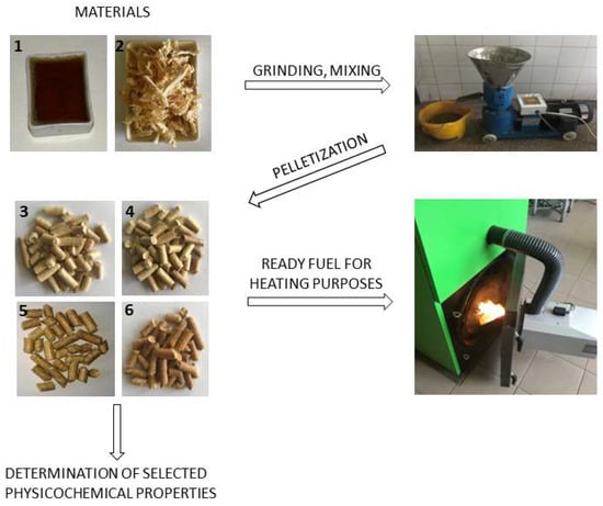 Four types of pellets were analyzed in the study: pine pellets without and with 2.5, 5 and 7.5% by weight share of waste glycerol. In the further part of the paper, the abbreviations “PP” for pine pellet and PP g for pine–glycerol pellet were used, respectively. The glycerol mass percentage in the pellet is specified at the end of the symbol (e.g., PP-G5 for pellets containing 5% wt of glycerol). The methodology for producing the analyzed pellets is shown in Figure 2.
