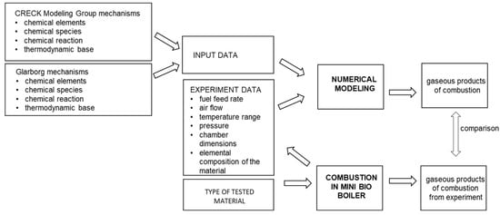 The purpose of these considerations was to develop a numerical simulation procedure that would most reliably represent the chemical kinetics of the pine pellet combustion process. As suggested by previous research conducted by the authors, two combustion mechanisms were used for the calculations [59]: