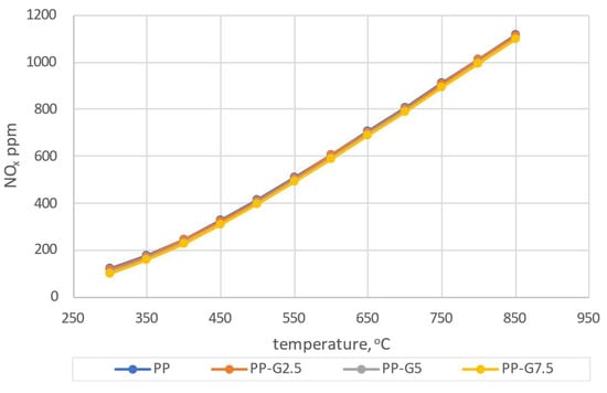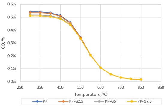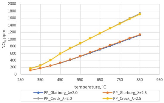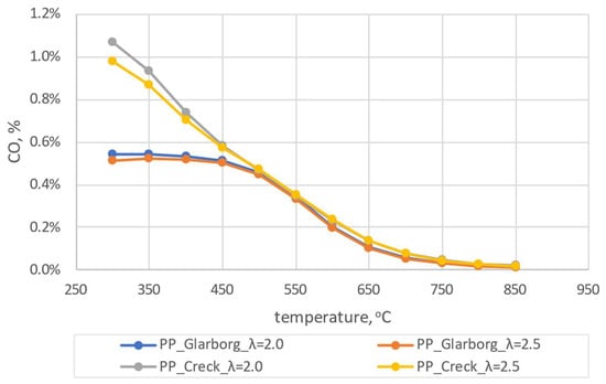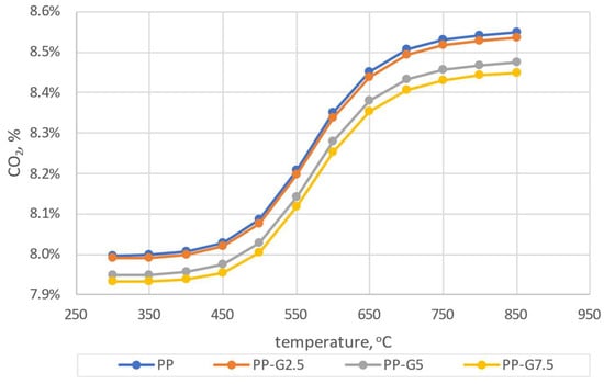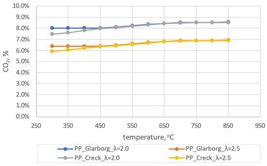 Comparing the results of the numerical simulations with the experimental results, a greater convergence with the calculations carried out using the mechanism developed by Glarborg was found (Figure 7a). In the case of calculations taking into account the Creck mechanism, discrepancies with the experiment of almost 400 ppm can be seen for the NOx concentration. The CO2 concentration depends on the coefficient of excess combustion air and shows a similar tendency for both mechanisms. In the case of the CO concentration, there are significant discrepancies between experimental and calculated results. However, in the case of the Glarborg mechanism, these discrepancies are smaller. Such a similarity was also observed in a previous article [59]. Due to the above, the Glarborg mechanism was taken into account for further comparative analyses. Analyzing the results presented in Figure 7a, the greatest convergence can be observed for the model results obtained for T = 650 °C and λ = 2.0, and therefore, these parameters were taken into account for further considerations. Target numerical tests were carried out for four types of analyzed pellets (PP, PP-G2.5, PP-G5 and PP-G7). Simulations were carried out based on the experimental conditions presented in Table 1 and Table 2 (chamber dimensions, fuel consumption, air stream, elemental composition of pellets). Simulations were carried out for the temperature range of 300–850 °C. The results of the dependence of changes in CO2, CO and NOx concentrations on temperature for the four considered pellets are shown in Figure 8, Figure 9 and Figure 10.