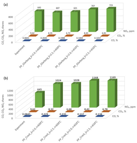 It can be concluded from the simulations that the addition of waste glycerol has an effect on reducing the CO2 concentration in the entire range of the analyzed temperatures. A similar tendency is noticeable in the case of CO concentration in the lower temperature range, up to about 500 °C. At higher temperatures, the differences resulting from the different additions of glycerol are not so significant. In the case of the analysis of the NOx concentration, no significant deviations depending on the temperature are observed. To illustrate the exact range of concentration differences, taking into account the previous considerations (3.1) and knowing the conditions of the experiment, the results of the simulation for the temperature of 650 °C were taken into account for the comparative analysis (Figure 11).