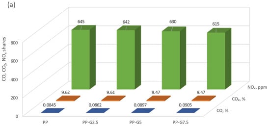 Table 1 shows that the addition of glycerol increases fuel consumption which in turn contributes to an increase in the air flow. It results from Table 2 that the addition of glycerol contributes to an unsignificant reduction in pellet moisture. This is a rather unexpected result, since the applied glycerol contained ca. 10% of water, and it presumably results from the hygroscopic properties of glycerol. After the combustion of each type of analyzed fuel, the amounts of ash remaining were slightly lower for fuels containing 5% and 7.5% glycerol additions than for PP and PP-G2.5. A similar relationship was observed for bulk density. The trends observed in the above results are also confirmed by other research studies [44,45,47]. The calorific value of the waste glycerol (22.6 MJ/kg) is a little greater than that of pine sawdust utilized for pellet manufacturing (17.63 MJ/kg), and therefore, the increasing additions of glycerol to the pellets give rise to a slight increase in the calorific value.