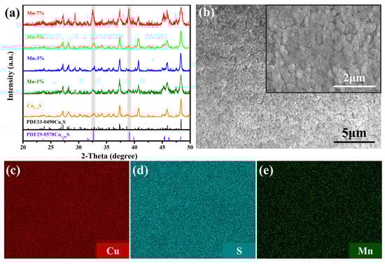 (a) XRD patterns of the Cu2−xMnyS films with varying doping content of Mn. (b) A typical SEM image at low magnification, inset at high magnification. (c–e) Corresponding element mappings of the Cu2−xMn0.05S film.