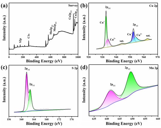 XPS spectra of the Cu2−xMn0.05S film. (a) Survey scan. (b–d) High-resolution scans for Cu 2p, S 2p, and Mn 2p, respectively.