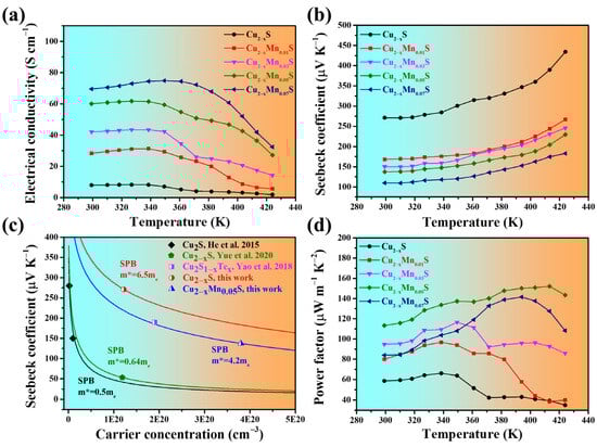 The temperature-dependent (a) electrical conductivities and (b) Seebeck coefficients. (c) Seebeck coefficient as a function of carrier concentration for Cu2−xS-, Cu2−xMn0.05S-, and reported Cu2−xS-based bulks [21,50,51] at 300 K. (d) Temperature-dependent power factors of the Cu2−xMnyS films.