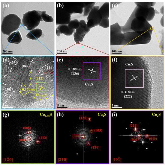 To further understand the internal microstructure, TEM was applied for observation of the grains scraped from the optimal film, and the result is shown in Figure 4. The grain sizes were ~20–300 nm. In the HRTEM image (Figure 4d), the measured lattice spacings of 0.305, 0.266, 0.315, and 0.194 nm are in good agreement with those of the (132), (042), (−114), and (630) planes of monoclinic Cu2S, respectively. And there are edge dislocations in the grains, which may be the lattice distortion caused by Mn doping. In addition, Cu1.96S is observed. Figure 4g shows an FFT image of the grain circled in a yellow dotted line, and the interplanar spacing is about 0.170 nm, corresponding to that of the (212) plane of Cu1.96S [52]. Figure 4e,f,h,i demonstrate that the lattice spacings are 0.188 and 0.318 nm, which correspond to the (−136) and (222) planes of Cu2S. Thus, the TEM results also confirm that the Cu2−xMn0.05S film contained two the phases, Cu2S and Cu1.96S.