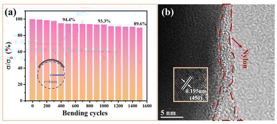 Flexibility is also a key factor in the practical application of f-TEFs. The thickness of the Cu2−xMn0.05S film was approximately 8.96 μm (see Supplementary Figure S7). And Figure 5a shows the corresponding flexibility test result: the σ maintained at 94.4%, 93.3%, and 89.6% of the original after being bent around a 4 mm-radius rod 500, 1000, and 1500 times, respectively. This is better than the flexibility of the reported Cu2S/PEDOT:PSS composite films [32] (the resistance rose 10% after bending 1000 cycles under a bending radius of 4 mm). The main reasons for the good flexibility are as follows: (1) the nylon membrane possessed excellent flexibility and (2) the combination between the porous film and the nylon membrane was good (see Figure 5b).