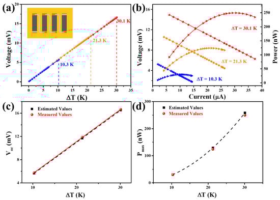 Figure 6a gives the variation of open-circuit voltage (Voc) with ΔT. When the ΔT values were 10.3, 21.3, and 30.1 K, the Voc values of the f-TEG were 5.74, 11.86, and 16.65 mV, respectively, which is close to the values (see Figure 6c) calculated by the equation: (N is the number of f-TEG legs). Figure 6b shows the output properties of the f-TEG by adjusting the load resistance (Rload) under different ΔT. Output voltage (Vout) and output current (Iout) show a negative correlation. The output power (Pout) of the f-TEG can be calculated by the equation below: