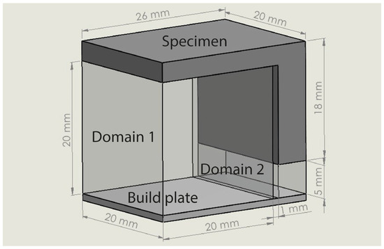 Figure 3. The two domains where support structures were generated are highlighted in light grey (transparent mode), while the L-shaped specimen is in dark grey. Domain 1 (20 × 20 × 20 mm) supports the bigger ledge overhang, while domain 2 (20 × 5 × 5 mm) supports the smaller overhang, which first anchors the specimen to the built plate. Underneath the two domains, a part of the build plate is also illustrated. In this study, only the performance of the supports in domain 1 was investigated. Domain 2 remained in a fully dense support volume for every support alternative.