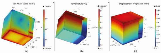 After the completion of the thermo-mechanical simulations, in order to evaluate the performance of the support structures, four responses were investigated: support volume, thermal stress, plate temperature, and overhang displacement. The volume of the support structures was measured in SolidWorks. Then, they were exported in STEP format and imported one by one in COMSOL where the simulations were conducted.