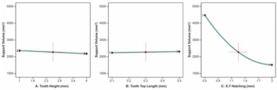 Figure 8. It was found that tooth height and tooth top length barely affected the support volume, while X, Y hatching had the most significant effect by far, since, as the hatching distance increased, the support volume decreased significantly. This is because a significant amount of material is removed from the support structure’s main body as the total number of inner grid walls decreases.
