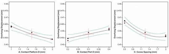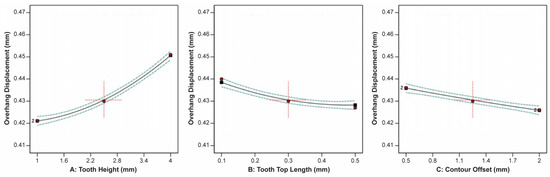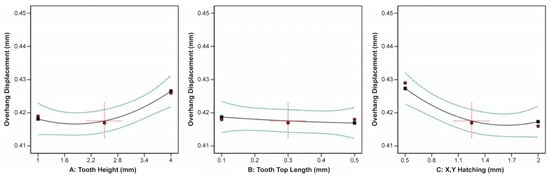 Figure 11. It was observed that tooth height and X, Y hatching had the most significant effect on the overhang displacement, while the tooth top length barely affected the displacement. Thus, as the tooth height increased, the overhang displacement increased as well, while as the X, Y hatching increased, the overhang displacement greatly decreased.