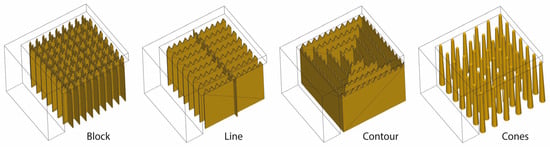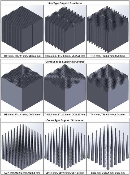 42]. According to the literature, block, line, contour, and cone supports are the most commonly used support structures in LPBF; consequently, our study focused on investigating these specific types of support structures.