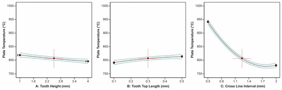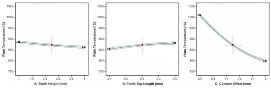 Figure 10, it was found that as the tooth height increased, the plate temperature slightly decreased, while as the tooth top length increased, the plate temperature slightly increased. In addition, the X, Y hatching had the most significant effect since as the hatching distance increased, the plate temperature decreased significantly.