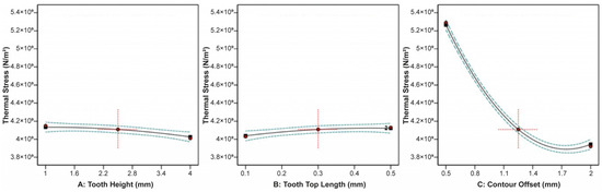 Figure 9. It can be observed that tooth height barely affected the thermal stress, while as the tooth top length increased, the thermal stress slightly increased. On the other hand, as X, Y hatching increased, the thermal stress greatly decreased. Similarities were found in the correlation between the impact of tooth height, tooth top length, and X, Y hatching on the plate temperature since these two responses were strongly connected to each other. As illustrated in