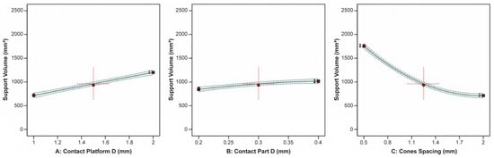 For cone supports, the optimal solution was characterised by average to high values of contact platform diameter (1.7 mm), the highest value of contact part diameter, and average values of cone spacing (1.27 mm);