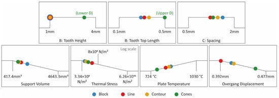 Figure 2). On the other hand, based on the criteria that better satisfy the performance measures, the plots and the numerical optimisation results showed that low values of tooth height, average values of tooth top length, and average to high values of X, Y hatching resulted in optimised block support structures, which were able to minimise the risk of defective parts and build failures. Further analyses and comparisons regarding the optimal solutions are recorded in