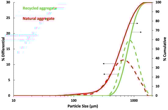 Standard and recycled aggregate distributions are both similar. Natural aggregates present a range between 0.1 and 1.5 mm and recycled between 0.4 and 1.5 mm. The average particle size of natural sand is 620 µm, while recycled is 830 µm.