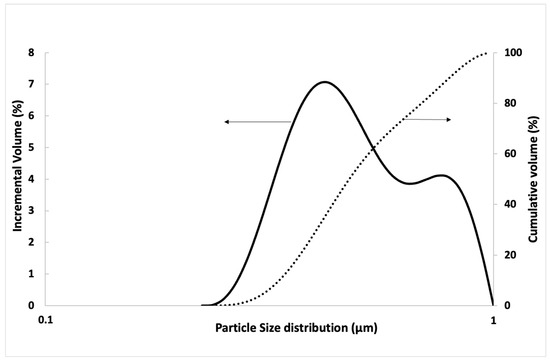 The GO solution was obtained from Graphenea and had a concentration of 4 g/L. However, the GO distribution is represented in another figure (Figure 3) due to its big size difference compared to the others. Particle size distribution of GO was determined after the following process: stirring for 24 h, followed by sonication for 30 min with a 360 W ultrasonic machine using the same GO/water used in this work and with the same superplasticiser dosage. Cumulative per cent is represented by continuous lines, while incremental per cent by dotted lines. Figure 3 shows that the size of the GO is less than 1 μm; GO requires a previous ultrasonication process to achieve a nanometric size.