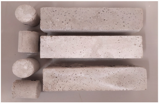The samples were de-moulded after 24 h. All mortars were cured under water for 23 days at 20 °C and exposed to air for another four days. Figure 4 shows what parallelepipeds and cylinders looked like; as shown in Figure 4, efflorescence is not observed in the samples.
