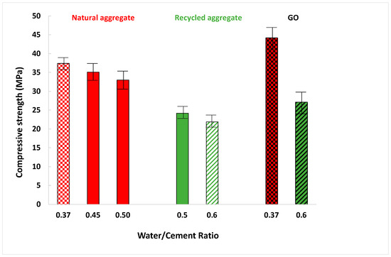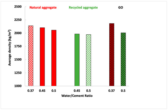 Regarding the density, several factors have been analysed. Figure 5 shows the density difference between mortars manufactured with natural or recycled aggregates, different water ratios, and with or without GO addition.
