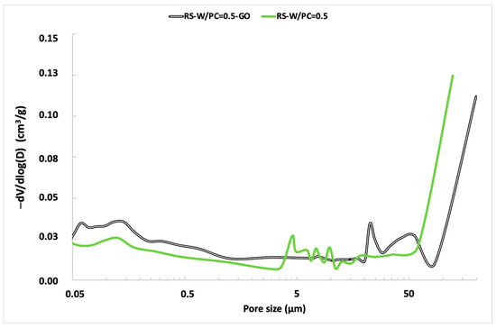 On the other hand, there is no density difference due to GO addition because the percentage of GO in the mix is inadequate, and it does not affect significantly. Nevertheless, the effect of GO on the pore size distribution was very significant (Figure 7). The number of large pores (higher than 50 μm) decreased, and a more significant number of pores between 10 and 50 μm appeared. The same occurred for those in the range between 0.05 and 1 μm; owing to the GO addition, the number of pores of that size was increased. By adding GO, large pores decreased and were divided into smaller pores of different sizes (Figure 6C).