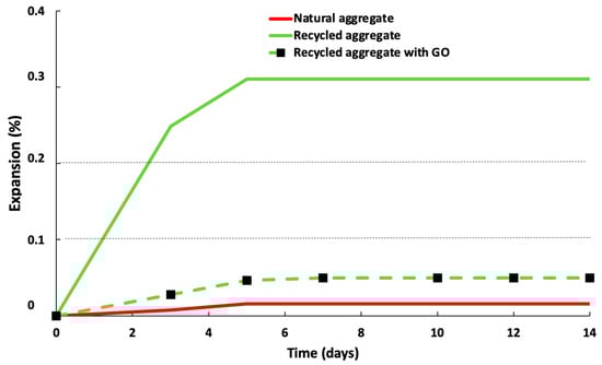 Expansion measurements were taken under ASTM C 1260 [51]. Each mortar mix was cast into three 25 × 25 × 286 mm mortar bars and three different compositions: NA) cement/natural aggregate = 1/2.25; RC) cement/recycled aggregate = 1/2.25 and RC-GO) cement/recycled aggregate = 1/2.25 with GO/cement = 0.1/333.33. All the samples used a water/cement ratio = 0.47. Following the initial curing step, specimens were de-moulded and stored in water at 80 °C for 24 h. After that, the specimens were immersed in a 1 N NaOH solution at 80 °C to speed up the alkali–silica reaction and expansion. Expansion measurements were taken at two-day intervals.