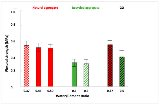 On the other hand, comparing the influence of each aggregate, a significant difference was observed: the recycled aggregate mortar presents a low flexural strength. GO addition led to a slight improvement when mortars were in both sands. The bond strength between GO and the mortar matrix depends on multiple factors, such as GO dosage, ultrasonication process, matrix composition, and water/cement ratio [59] As the ultrasonication process seems adequate (Figure 3), in this case, the matrix composition and water/cement ratio used decreased the density of the mortar matrix, decreasing the quality of GO dispersion (see Table 1) by blocking the free movement of GO [59]. Recent studies [60] showed that flexural strength increased when another industrial waste material was employed as a substitute for fine aggregates, such as quarry dust or limestone dust, with a water–cement ratio of 0.52, like the one in this research. Flexural strength obtained using mortars partially made of quarry or limestone was up to 25% higher than those manufactured with only natural fine aggregate.