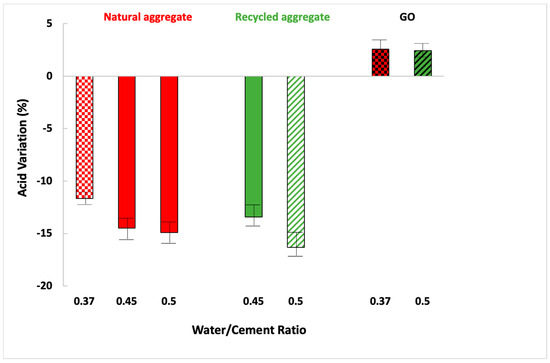 GO enhanced their compressive strength after the acid test (at the same water/cement ratio). GO causes the bigger pores to close, preventing acid from entering the matrix’s core (Table 5 and Figure 7). It is, however, not entirely free of pores. Small amounts of sulphate eventually enter the sample and react to generate a small quantity of ettringite, which favours the specimens’ strength [65].