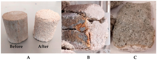 Figure 12A shows two samples made of recycled sand (RA-0.5), where the outside of the right one is white due to the formation of CaSO4·H2O during the acid attack. Figure 12B shows the inside of the attacked mortar (RA-0.5) after the compression test, where it can be seen that the acid has penetrated the interior area of the mortar through the pores [25]. Figure 12C shows what the inside of RA-0.5-GO looked like after the compression test, where the cementitious colour remained with some white dots because the acid had not penetrated in high quantities inside the sample.