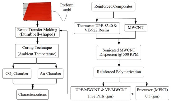 A dumbbell-shaped mold was designed according to ASTM D638–03 and tailored using 3D printers. The preparation method for the standard (Std) reinforced composite samples (without MWCNTs) and the dumbbell-shaped preform mold that was printed with a 3D printer has been explained in detail elsewhere [29]. Figure 1 shows a detailed protocol for the UPE- and VE-reinforced nanocomposite fabrication. Table 1 summarizes the composition of VE/MWCNT and UPE/MWCNT nanocomposites. Before being used to make the dumbbell-shaped reinforced nanocomposite samples, each thermoset (UPE and VE) resin was degassed for at least an hour in a vacuum oven at a vacuum pressure of 2 bar. After degassing and drying the thermoset resins and MWCNTs, the selected quantity of MWCNTs was loaded into each thermoset resin using a disposable polypropylene (PP) bottle.