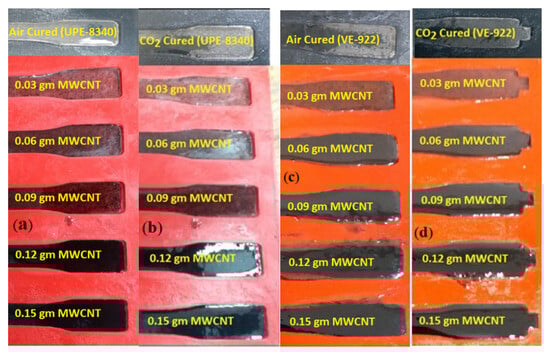 Based on the lowest shrinkage of air- and CO2-cured UPE-8340 and VE-922 matrices, the best ratio of resin (5 mL) to hardener (0.3 mL) was selected for the reinforced nanocomposite dumbbell-shaped structures [29]. At first, we attempted to disperse a higher concentration of MWCNTs (1 wt.%). In resins, perhaps because of the higher surface of MWCNTs, we faced severe issues of dispersion; consequently, we selected the lowest quantity of MWCNTs in both resins. Figure 2 shows that both polymer-reinforced nanocomposite samples (air- and CO2-cured) with a concentration of 0.03 wt% of MWCNTs had visible nanotube dispersions and kept their optical clarity with only a slight change in color. It can be clearly seen that the lowest quantity (0.03 to 0.09 gm) of MWCNTs in both the epoxy matrix and the polymer revealed itself to be effectively fused and aligned physically. These findings show that a high-shear mechanical coil mixer, followed by sonication at a longer duration, results in significant dispersions and alignment of MWCNTs in both resins. Even the higher quantities of MWCNTs (0.15 g) revealed significant dispersion, and it can be seen that the entire surface of the MWCNTs is covered by a polymer layer in both curing techniques. Gupta et al. [27] also used a higher-shear mechanical stirrer and a sonication technique to disperse the MWCNTs in Epon 862 epoxy resin. They reported that planetary shear mixing improved nanotube dispersion in epoxy. Moreover, to characterize the dispersion of MWCNTs in cured composite samples, they used three complementary techniques: optical microscopy, Raman spectroscopy, and scanning electron microscopy. For their cured sample, the optical micrographs and Raman images showed reduced agglomeration and a homogeneous distribution of MWCNTs in the epoxy matrix. Bower et al. [42] also reported that the lower quantity of MWCNTs can produce a strong bonding attachment with the polymer matrix. They validated their reinforced nanocomposite interpretation using transmission electron microscopy (TEM).