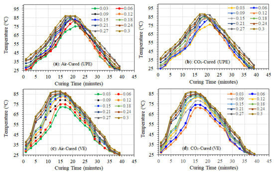 Figure 5a–d show how the temperature changed over time when the resin matrix was being cured at lower and higher quantities of MWCNTs. These time–temperature curves show the type of temperature change and the shortest amount of time needed for the resin to cure with the ideal resin-to-hardener ratio (16:1). Figure 5 shows that using lower concentrations of MWCNTs (0.03% to 0.18) reduced the air-cured cycle time linearly in both the UPE and VE nanocomposite matrix. Similar exotherm graphs were also observed in CO2-cured samples of MWCNTs, varying for each resin. However, in comparison to air-cured nanocomposite matrices, the CO2-cured gel time to hardness time cycle had a shorter cycle. This is most likely due to the non-existence of external scavengers such as O2, N2, humidity, and airborne particulate matter.