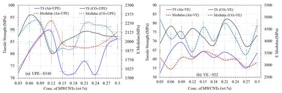 From Figure 6a,b, it was noticed that the VE-922 matrix (cured under air and CO2), on the other hand, does behave very differently from UPE-8340 and has a relatively low tensile strength at different MWCNT contents. Despite the fact that the dispersion in the polymer matrix was achieved using high-intensity sonication, it could be most likely due to a lack of MWCNT interaction with the functional group of esters in the polymer of the VE matrix, particularly at higher MWCNT contents. Nonetheless, the air-cured UPE-8340 with 0.12 MWCNTs has a higher tensile strength of 89.12 MPa and an E-modulus ≈ 2285.9 MPa at a maximum load of ≈2201.3 N. The CO2-cured UPE nanocomposites, on the other hand, contain 0.09 MWCNTs and have a maximum tensile strength of ≈95.8 MPa and an E-modulus of ≈2255.04 MPa at a maximum load of ≈2222.9 N. However, the higher contents of MWCNTs in both nanocomposite matrices show lower tensile strengths and E-moduli at maximum load in both curing techniques. It is shown that during CO2 curing, the absence of moisture could reveal the good dispersion of a lower content of MWCNTs, but also perhaps significant adhesion between the resin matrix and MWCNTs. The similarity was also observed in CO2-cured VE nanocomposite resins. The air-cured VE-922 with 0.09 MWCNTs has a higher tensile strength of 69.32 MPa and an E-modulus ≈ 3319.44 MPa at a maximum load of ≈ 1621.8 N. The CO2-cured VE nanocomposites containing 0.06 MWCNTs have a maximum tensile strength of ≈ 78.34 MPa and an E-modulus of ≈ 4095.738 MPa at a maximum load of ≈ 1770.12 N.