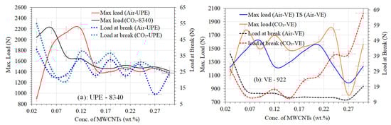 The maximum load and load at break of both nanocomposite samples are shown in Figure 7a,b. The trends followed a similar pattern, as shown in Figure 6a,b. The maximum load of UPE-8340 and VE-922 improves with the addition of lower contents of MWCNTs. The air-cured UPE-8340 achieves its maximum load of ≈2201.29 N and its load at break is about ≈33.14 N with the addition of ≈0.12 wt.% of MWCNTs, and the minimum load at break is 10.9 wt.% of MWCNTs in the UPE-8340 nanocomposite matrix. The CO2-cured UPE-8340, on the other hand, has a nearly 1.1-fold higher maximum load and a ≈26.73 N load at break. The lower maximum load of 80.2 N and the load at break of about 37.8 N of CO2-cured UPE-8340 were achieved along with the highest maximum load of about 69.3 N and the maximum load at break of ≈14.69 N of air-cured VE-922 nanocomposite containing 0.09 wt.% of MWCNTs. The air-cured VE-922 sample, which contains 0.03 weight percent of MWCNTs, achieved the lowest maximum load and a load at break of about 52.25 and 40.33 N, respectively. The CO2-cured VE-922 shows significant differences in maximum load and load at break compared to the air-cured VE-922 nanocomposite samples, as can be clearly observed in Figure 7b.