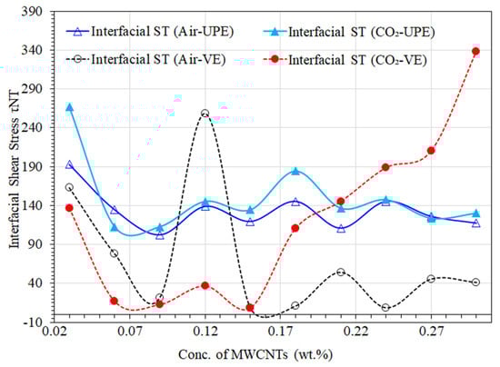 Figure 8 shows the interfacial shear stress of air- and CO2-cured UPE and VE matrices with various quantities of MWCNTs. It has been found that the strength of UPE-8340 and VE-922 nanocomposites is directly influenced by the quantity of nonfunctionalized MWCNTs in the matrix. As seen in Figure 6 and Figure 7, the higher the content of MWCNTs, the lower the tensile properties. As can be seen in Figure 8, the higher contents of MWCNTs in the polymer matrix show higher interfacial shear stress except for 0.03 wt.% of MWCNTs. The lowest MWCNT contents are likely to be 0.03–0.06 wt.%, indicating an appropriate dispersion with the polymer matrix and thus an ability to sustain the large loading stress in the interphase region and high interfacial shear strength; this tendency is expected. A low interfacial shear strength, however, is unable to resist significant stress and splits or shatters when it faces higher mechanical and thermal loads. On the other hand, the higher content of MWNTs in the polymer matrix shows higher shear stress. This is attributed to the nanocomposite’s tight structural morphology in both polymer matrices. The capacity of the interphase area for stress transfer between the polymer matrix and the MWCNTs can be said to be determined by the interfacial shear strength. As a result, Equations (5) and (6) express how the interfacial shear strength directly influences the tensile strength of nanocomposites [60].
