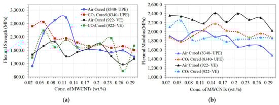 Furthermore, the mechanical properties of all nanocomposite samples improve when lower contents of nonfunctionalized MWCNTs are added to UPE and VE resins. Compared to VE, the UPE nanocomposite’s flexural strength is almost twice (0.12 wt.% of MWCNTs) as high, but it shows a lower flexural modulus in air-cured samples, and the sample suggests that perhaps the CO2-cured nanocomposite samples show optimized mechanical properties compared to air-cured samples. It is revealed that the lower content of MWCNTs may restrict the maneuverability of polymer cross-link chains during the curing reaction and modify the final structure of the cross-linked network of the UPE and VE. In addition, firming of intermolecular strengths between the thermoset resins and MWCNTs may occur, which facilitates an active transfer of internal stresses between both the thermoset polymer and MWCNTs, leading to the enhancement of the flexural properties of UPE/MWCNTs and VE/MWCNTs nanocomposites.