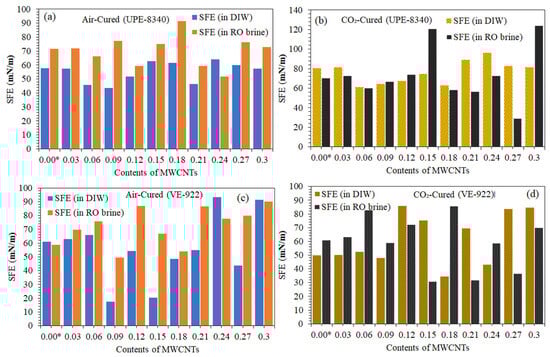 Surface energy of various amount of MWCNT nanocomposites in DIW and seawater reverse osmosis brine water (79,000 ppm). (a) SFE of air-cured UPE nanocomposites in DIW and RO brine; (b) SFE of CO2-cured UPE nanocomposites in DIW and RO brine; (c) SFE of air-cured VE nanocomposites in DIW and RO brine; (d) SFE of CO2-cured VE nanocomposites in DIW and RO brine.