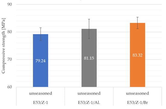 Looking in detail at the results obtained from the samples after 2 months of seasoning, it can be seen that the highest average compressive strength among the compositions tested was obtained for samples seasoned in highly mineralized water in the case of the E53/Z-1/Br composition (86.08 MPa), while the lowest was obtained for the E53/Z-1 composition seasoned in a high-sugar beverage (77.6 MPa). The difference between these extreme averages was 8.48 MPa, which represents 9.8%. The behavior of the tested compositions in low-mineralized water and the high-sugar beverage was quite similar, as can be seen by only a 3.2% and 4.23% difference between the largest and smallest results obtained. However, in the case of the high-mineralized water, it was 6.75%, and in the medium-mineralized water, it was 8.3% (78.72 MPa–E53/Z-1/Al vs. 85.84 MPa E53/Z-1/Br).