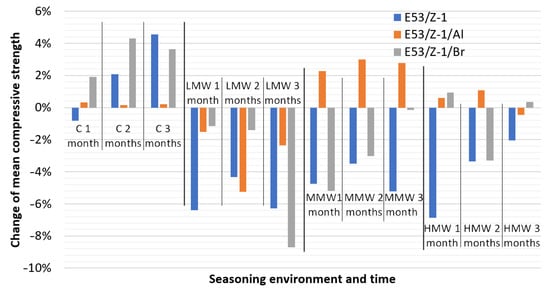 Figure 4 shows the change in compressive strength compared to the unseasoned material specimens (Figure 2). A detailed analysis of the strength changes as a function of seasoning time and environment is presented for the individual compositions later in this paper.