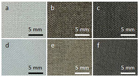 Cotton (a–c) and PET (d–f) fabric samples before coating with GO (a,d), after coating with GO (b,e), and after thermal reduction of GO (c,f).