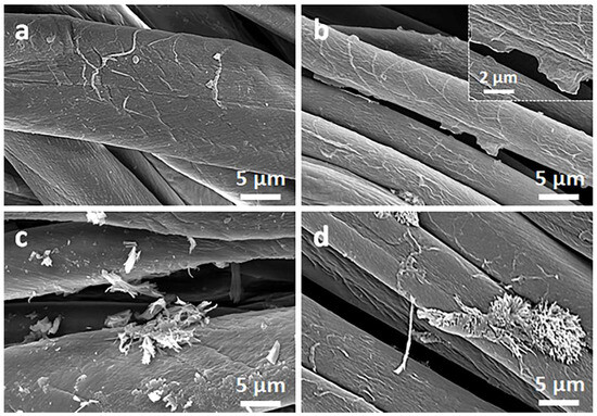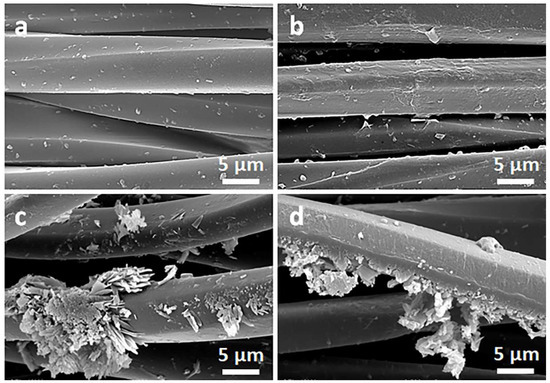 On the contrary, on the fibers immersed in a Q solution in ethanol, Q crystals were easily observed before and after the thermal reduction of GO, as illustrated in Figure 2c,d and Figure 3c,d. It is worth noting that the thermal treatment did not alter the cotton and PET fiber surface morphology.