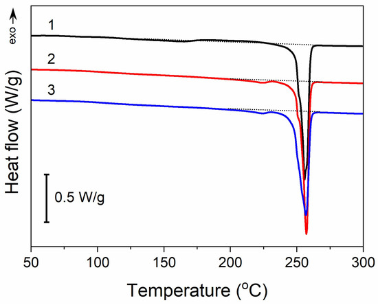 DSC heating thermograms of PET fabric before thermal treatment (1), after thermal treatment analogous to that during thermal reduction of GO (2), and (3) after thermal reduction of GO (PrGO/Q1). Heating rate of 10 °C/min.