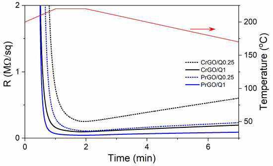 Exemplary dependencies of electrical surface resistivity, R, of the GO-coated cotton and PET fabric on time during Q-assisted thermal reduction of GO (black and blue lines) and temperature dependence on time (red line).