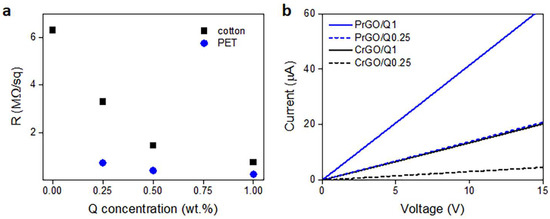 Cellulose is a polymer composed of d-glucose units linked through covalent β-1,4- glycosidic bonds. We hypothesize that the glucose units could assist the thermal reduction of GO, as glucose is a mild reducing agent for GO and was recently used to synthesize glucose-rGO-supported Ag-Cu2O nanocomposites [51]. The application of Q to assist the reduction of GO permitted a reduction in the R of the fabrics; it decreased with increasing concentrations of Q in ethanol solutions, as shown in Figure 6a, although the dependence was weaker for larger Q concentrations. At 1 wt.% Q concentration, an R of 750 kΩ/sq and 240 kΩ/sq was achieved for cotton (CrGO/Q1) and PET (PrGO/Q1) fabrics, respectively. However, the R values of CrGO/Q were higher than those of PrGO/Q. We hypothesize that after the strongly enhanced reduction of GO, the surface morphology of the fibers becomes an important factor. The surface roughness of cotton fibers, illustrated in Figure 2, could negatively affect the contacts between rGO platelets and this could result in a higher resistance of the rGO-conducting network on fiber surfaces. It is worth mentioning that an adverse effect of polylactide surface roughness on the formation of a conducting network of multi-wall carbon nanotubes (MWCNTs) was observed by us previously [52].