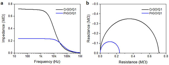 Electrical impedance modulus of CrGO/Q1 and PrGO/Q1 (a) and Nyquist plots of reactance vs. resistance (b).