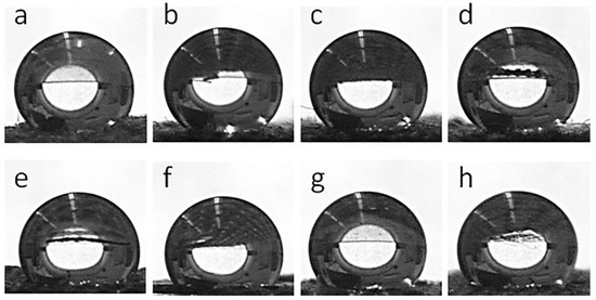Water droplets deposited on fabric surfaces: CrGO (a), CrGO/Q0.25 (b), CrGO/Q0.5 (c), CrGO/Q1 (d), PrGO (e), PrGO/Q0.25 (f), PrGO/Q0.5 (g), and PrGO/Q1 (h).