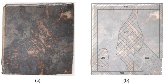 The view of the plate after EH (a) and the identified zones on its surface (b), namely: the shearing zone (ShZ), the plastic deformation zone (PDZ), the zone of significant changes (SCZ) and the zone in which there was a rigid support on the underside (SUP).