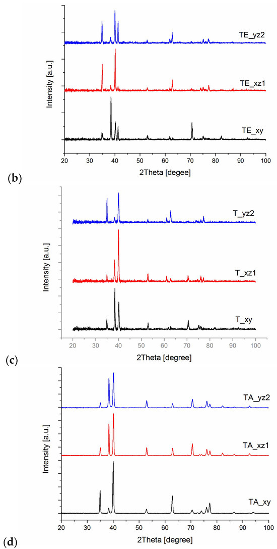 Pure titanium crystal growth and phases are determined according to the parameters of the manufacturing process. During crystal growth, different kinds of dislocations or defects can be formed. Therefore, titanium crystal may contain defects such as dislocations cells and walls, statistically stored random dislocation, geometrically necessary dislocations, disclinations or disconnections, dislocation loops or a combination of these defects [25]. The WAXS profiles of the XY, XZ1, YZ2 cubic surfaces of explosive deformed titanium TE, initial state pure titanium T and titanium alloy TA are illustrated in Figure 4; the diffraction profiles of T and TE might be indexed as a hexagonal α-Ti type structure (the space group of P63/mmc). The TE profile exhibits additional peaks that are characteristic of the ω phase. The martensitic phase with (11 2 0) was observed on all of the analyzed surfaces (XY, XZ1, YZ2) of TE. Previously, after explosive deformation treatment, a peak of the ω phase orientation was observed within 1400 μm from the treated surface [26]. In our case, the profiles suggest the occurrence of explosive-induced α-ω martensitic transformation in the whole volume. The direct mechanism of the pressure driven α→ω martensitic transformation in pure titanium has been described by several authors [27]. The WAXS profiles of T and TE indicate diffraction from a crystal structure with maximums at 35°, 38.5°, 40.3° and 53.1° corresponding to the (100), (002), (101) and (102) lattice planes. The TA profiles are characteristic of the β-phase (bcc), as reported by other authors [28,29]. Comparing the analysis direction of the same sample (XY, XZ1, YZ2), a change in the relative intensities was observed for the main peaks: (100), (002) and (101). It is well-known that for an ideal perfect crystal, the scattering from atoms adds to the construction under Bragg’s conditions, which results in a delta function (δ-function)-like intensity distribution. Defects present in crystals may break the long range symmetry of the crystal lattice, which redistributes the scattering intensity. Point defects, small dislocation loops and precipitates undergo a change in their integral intensity, a shift in their peak position and diffuse scattering while maintaining the symmetry of the line shape [30]. Defects of the second kind cause asymmetrical peak broadening; the second kind includes dislocations, disclinations/disconnections, disclination dipoles, stacking faults, twins, boundaries, long cylinder-like chains of impurities, etc.