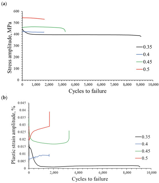 A low-cycle fatigue test at total strain amplitudes of 0.35%, 0.4%, 0.45% and 0.5% allowed us to observe how the stress amplitude and plastic strain amplitude change as a function of the number of cycles (Figure 5a,b).