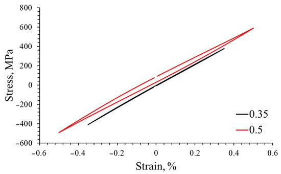 The comparison of the stabilized hysteresis loops for strain amplitudes of 0.35% and 0.5% indicates an increase in energy dispersion in the cyclically deformed material at higher strain amplitudes (Figure 6).
